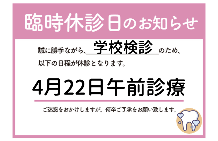 4月22日午前診療は学校歯科検診への従事のため休診となります。